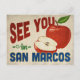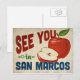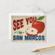 Carte postale San Marcos California vintage avec une belle pomme rouge, avec un texte amusant de style rétro qui dit : "Voir à San Marcos"