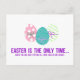 Ce drôle de design de Pâques présente des oeufs colorés de Pâques et dit "Pâques est la seule fois où il est sécuritaire de mettre tous vos oeufs dans un seul panier." Customisez ceci avec vos propres images ou texte en cliquant sur le bouton "Customiser".
