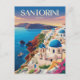 Conception de voyage vectorielle rétro de Santorin. Santorin, le joyau des Cyclades, est mondialement connu pour ses vues spectaculaires sur la caldeira, ses villages blancs perchés sur les falaises et ses couchers de soleil inoubliables.