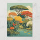 Un paysage de safari africain luxuriant et stylisé, avec des feuillages vifs en rouge, oranges, jaunes et verts autour d'un étang tranquille, parfait pour un décor et des cadeaux sur le thème de la nature.