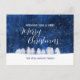 Joyeux Noël carte postale plate a des oeuvres originales avec une scène de nuit bleu et blanc de neige avec des arbres et texte blanc pour un accueil de vacances artistique. Ajoutez votre nom pour une carte de Noël personnalisée. Image originale copyright Ann Powell tous droits réservés.