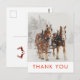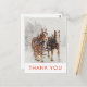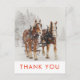Une carte de remerciement avec une photographie en extérieur représentant une équipe de 2 chevaux de trait belges tirant un traîneau. Des flocons de neige tombent doucement avec des pins enneigés en arrière-plan. Au verso, une illustration de 2 cerfs sautants avec une couleur à carreaux rouge au-dessus de votre texte personnalisé.