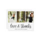 Une photo moderne vous remercie carte postale conçue pour accueillir trois de vos photos mariages préférées alignées côte à côte. "Amour et merci" apparaît en bas dans le script de style manuscrit noir. Personnalisez avec vos noms et/ou la date mariage en dessous. Les cartes postales sont inversées pour montrer votre adresse de retour avec suffisamment d'espace pour l'adressage du destinataire, ainsi qu'un message pré-imprimé et une photo supplémentaire en option. Si vous préférez ajouter un message manuscrit, supprimez simplement l'exemple de texte affiché.
