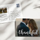 Une photo moderne et élégante merci carte postale conçue pour accommoder votre photo mariage horizontale ou paysagère préférée avec "remerciant" comme un script de calligraphie blanche superposition. Personnalisez avec vos noms et/ou la date mariage en dessous. Les cartes postales sont inversées pour montrer votre adresse de retour avec suffisamment d'espace pour l'adressage du destinataire, ainsi qu'un message pré-imprimé et une photo supplémentaire en option. Si vous préférez ajouter un message manuscrit, supprimez simplement l'exemple de texte affiché.