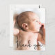 Personnalisé avec la photo du bébé sur le devant et un message spécial, les statistiques de naissance, les noms des parents et l'adresse de retour au dos de la carte postale d'annonce de naissance. Ce design utilise une police de caractères élégante et dessinée à la main pour les mots "Merci" pour un toucher de sophistication. Exprimez votre excitation en annonçant la naissance de votre enfant et envoyez votre gratitude en même temps. (fonctionne mieux avec des images au format vertical)