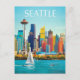 Apportez la beauté du Pacifique Nord-Ouest avec cette carte postale Seattle d'inspiration vintage qui présente le célèbre Space Needle, l'horizon coloré et les voiliers sur la baie.