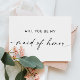 Posez l'une des questions les plus importantes de votre parcours de mariage avec cette carte minimaliste « Will You Be My Maid of Honor ? ». Ce design noir et blanc offre un look intemporel et moderne qui se sent à la fois réfléchi et élégant. Que vous planifiez une boîte de proposition de mariage ou que vous envoyiez une douce surprise par la poste, cette carte est un moyen parfait de poser la question. Le texte au verso est entièrement modifiable, vous pouvez donc personnaliser la formulation.