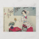 Une dame est assise devant une coiffeuse. Un porte-miroir et quelques ornements de cheveux sur la table montrent la simplicité de son habillage et de son maquillage. Deux lotus et de grands feuilles verts dans le vase, une branche de fleurs de prune répandit le parfum et indique également la pureté de cette dame. La direction de la branche de prune et des bras de la ladyï est tout à fait contraire à celle de sa position et de sa table, montrant une composition bien équilibrée.