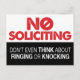 Cette carte postale "Pas de sollicitation" est juste la bonne taille pour placer dans la fenêtre avant ou sur la porte d'entrée pour empêcher les avocats de sonner ou de frapper!