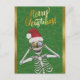 Cette carte postale a un squelette ridicule qui tient des ornements de Noël d'or et d'argent à ses prises de vue et porte un casquette de Père Noël rouge sur un arrière - plan vert avec une parties scintillant d'or faux et des bordures dorées brillantes avec un texte de Noël joyeux.