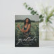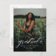 Célébrez vos invités de grade et d'invitation avec cette carte postale verticale de graduation en une photo qui comprend un script de calligraphie moderne et tendance sur le devant et un retour personnalisable pour les détails de votre fête.