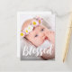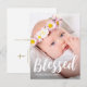 Carte de remerciement de baptême simple avec un joli texte de remerciement blanc dans une typographie moderne de pinceau avec une photo sur le devant, et un doux message de remerciement personnalisable avec une croix de couleur or et l'adresse de retour au verso de cette belle carte de remerciement d'occasion religieuse.