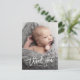 Cette carte de remerciement photo bébé comporte un merci calligraphié moderne en blanc avec une grande photo du client. Le verso comprend un message de remerciement que vous pouvez personnaliser pour chaque invité ou le supprimer complètement si vous préférez écrire votre merci à la main. Cliquez sur personnaliser pour personnaliser.