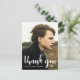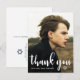 Simple typographie de remerciement blanc avec photo complète sur le devant, et un doux message de remerciement avec une étoile de david bleue et l'adresse de retour au dos de la carte postale.