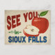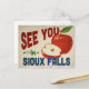 Une charmante carte postale de voyage vintage de Sioux Falls, dans le Dakota du Sud, représentant une belle pomme rouge, accompagnée d'un texte amusant de style rétro qui dit : "À bientôt à Sioux Falls".