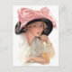 Jeune femme sirotant un soda tout en portant un grand casquette noir avec grand arc rose. Une magnifique scène vintage.