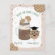 Illustration d'un milk-shake extrême garni de biscuits, de crème fouettée et de sirop de chocolat, entouré de biscuits et de confettis. Cookie avec lunettes et bonnet de graduation se tient à côté de milk-shake.