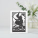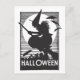 Design vintage de bois fait pour Halloween. Sorcière sur son balai devant une pleine lune de moisson avec des chauves-souris volant autour
