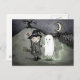 Une jolie image d'Halloween. Une petite sorcière et un fantôme se tiennent la main contre un arrière - plan sombre d'une lune brillante, un arbre effrayant et un cimetière éffrayant. petit coeur d'amour rouge au-dessus de leur tête.