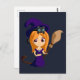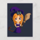 Carte postale avec une mignonne sorcière portant un grand casquette de sorcières violettes. Sa chatte noire se reposant sur le dessus de sa tête. Elle a de longs cheveux orange et porte un balai. Belle illustration de dessin animé parfaite pour l'halloween.