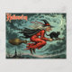 Il s'agit d'une carte postale horizontale d'Halloween au style vintage et coloré à la main, conçue pour ressembler à une pièce classique d'un vieil éphémère d'Halloween. L'image centrale est une caricature d'une sorcière volant sur un balai, avec son chat noir comme compagnon. La sorcière a un long nez accroché, un menton proéminent et un grain légèrement espiègle. Ses longs cheveux blancs et sa robe rouge coulent de façon spectaculaire, comme si elle était prise dans un vent fort. Elle porte un grand casquette noir pointu avec un ruban rouge. Sa chatte noire, avec sa queue voûtée haute, est assise derrière elle sur le balai, regardant vers le côté. La scène est dressée contre un ciel nocturne sombre et tourbillonnant avec un croissant de lune pâle en haut à droite. En contrebas, un petit village avec un clocher d'église est visible à l'horizon, ses lumières brillent. Le haut à gauche de la carte postale a le mot "Hallowe'en" dans une police décorative et rougeâtre. L'ensemble de l'image a une texture un peu grise, vieillie, et les couleurs sont vibrantes mais muettes, lui donnant un charme nostalgique et un peu éffrayant.