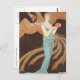 Style Art Déco Illustration de George Barbier d'une Jeune femme portant une élégante robe de soirée bleu clair aux accents perles. Elle a une tiare sur la tête et tient un miroir. L'arrière - plan est un phoenix doré sur brun.
