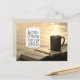 La carte postale des Écritures inspirantes représente une scène paisible d'une Bible ouverte assise à côté d'une tasse de boisson chaude à la vapeur, peut-être du café ou du thé, sur une rampe surplombant l'eau. Il présente la Bible Verse Psaume 46:10, "Soyez calme et sachez que je suis Dieu."