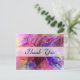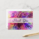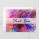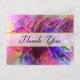 Une carte postale de remerciement avec un arrière - plan qui est un design abstrait qui a un look brillant en verre. Beaucoup de nuances pointues et des arêtes pointues lui donnent un look moderne cool. De nombreuses teintes de violet et de rose se mélangent pour donner à ce design une sensation de vie passionnante. Merci écrit à travers le centre dans une police de caractères fantaisie posée sur une couverture blanche transparente avec une bordure en or.
