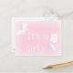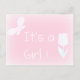 Spring baby girl - carte postale faire-part de naissance personnalisée. Design de texte délicat en rose clair avec le texte blanc "It's a Girl" .Il présente la silhouette blanche d'une tulipe et d'un papillon .Idéal pour annoncer la naissance d'une petite fille mignonne née au printemps.