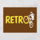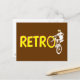 Un cycliste en VTT faisant du vélo. L'arrière - plan est noir et le vélo et le cavalier sont blancs. Le mot rétro est écrit en lettres de blocs jaunes avec des ombres roses. Ces couleurs sont également utilisées pour les lunettes de soleil des coureurs et pour la roue avant des vélos, qui forme le "o" à la fin du rétro.