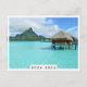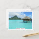 Carte postale d'un resort de luxe en bungalow sur l'eau dans le lagon bleu clair de l'île pacifique de Bora Bora, près de Tahiti en Polynésie française avec un bord blanc et dans une boîte blanche le texte : 'Bora Bora'.