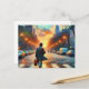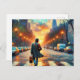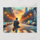Cette image représente une peinture artistique et colorée d'une personne qui se promène dans une rue de la ville au coucher du soleil ou au lever du soleil. L'individu est centré dans la composition, portant un long manteau et un casquette, portant un coque de guitare. La rue est bordée de voitures garées et éclairée par des lampadaires, avec des bâtiments s'élevant de part et d'autre. Le ciel est ébloui par des teintes chaudes d'orange, de jaune et de bleu, suggérant le début ou la fin de la journée.