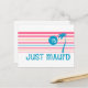 Le design de JUST MAUI'D rayé est parfait pour les jeunes mariés pour faire savoir au monde qu'ils viennent d'être mariés au paradis. Style rétro rayé bleu et rose avec un palmier et soleil. Le texte dit JUST MAUI'D. Ajoutez votre année ou votre message personnel. PinkInkArt original !