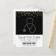 Enregistrez la carte postale de date avec un arrière - plan de couleur fractionnée noir et blanc. Faux confetti en or le long de la frontière supérieure. Illustré avec un stéthescope gris.