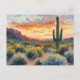 Ce design de carte postale présente un lever de soleil époustouflant dans le désert, avec une lumière dorée chaude illuminant les montagnes escarpées, le ciel coloré et les cactus emblématiques du saguaro. La scène est remplie d'arbustes du désert et de textures naturelles, capturant la beauté et la tranquillité du sud-ouest américain. Parfait pour les voyageurs, les amateurs de désert et les collectionneurs de cartes postales pittoresques, ce design est une façon merveilleuse de partager une note d'inspiration ou de garder comme souvenir. Il est également idéal pour toute personne qui apprécie l'art du Sud-Ouest et les vues spectaculaires du paysage.