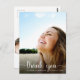 Une carte de remerciement de diplôme moderne avec la photo du diplômé superposée avec "merci" dans une écriture blanche avec des fioritures et leur nom et année de promotion en typographie blanche simple. Au verso, ajoutez une photo supplémentaire, personnalisez un message de remerciement et ajoutez leur nom dans une écriture ressemblant à une signature.