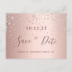Un féminin et glamour Enregistrer la carte Date pour une Sweet 16, 16e anniversaire. Un arrière - plan rose féminin, rose d'or faux métallique à l'aspect décoré avec une aspersion de diamant en or rose. Modèles pour une date et votre texte. Lettres de couleur or rose foncé. Le texte : Save the Date est écrit avec un grand script de style à la main tendance. Conseil : Si vous ne voulez pas qu'il ressemble à une carte postale, cliquez sur customiser, allez à l'arrière et retirez le séparateur et le timbre postal.