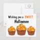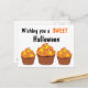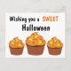 Les cartes postales comprennent 3 cupcakes Halloween avec glaçage orange et maïs bonbon sur le dessus dit, Wishing you a SWEET Halloween.