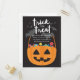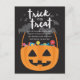 Joli design d'invitation Halloween noir et orange par Shelby Allison avec un seau à sucreries citrouille rempli de bonbons colorés avec les mots "tour ou gâter".
