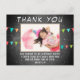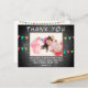 Joli drapeau à bouchon tableau noir photo d'anniversaire merci carte postale. Merci à votre invité d'être venu à la fête d'anniversaire de votre enfant! Le design a des drapeaux colorés de la fête d'anniversaire et une photo dans un cadre sur un tableau noir gris avec des taches blanches - insérez votre photo dans le modèle. Changez le message de remerciement si vous voulez et le nom de l'enfant.