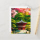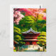 Un temple japonais paisible entouré de fleurs de cerisiers et d'arbres verts.