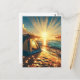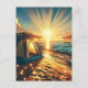 Jolie carte postale de camping à thème pour dire bonjour et rester en contact, avec une illustration d'une tente sur une plage au lever du soleil. Illustration Ai réalisée dans un art de style comique hyper réaliste.