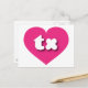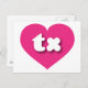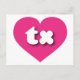 Cette carte postale est dotée d'un coeur rose vif et chaud qui contient les caractères gras, blancs, arrondis et coques inférieurs tx, une abréviation ludique pour le Texas, l'état étoilé solitaire. Le revers de la carte postale est vide, en attendant votre texte personnalisé ou vos sentiments manuscrits.