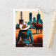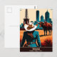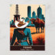 Texas : Tout est plus grand ! Vivez l'esprit vibrant du Texas avec une cowgirl fièrement face à une majestueuse lounghorn, face au contraste saisissant d'un derrick d'huile et d'un skyline de ville. Cette scène emblématique présente le riche patrimoine et l'énergie moderne de l'État Lone Star, où tout est vraiment plus grand et plein d'aventure ! Célébrez votre aventure avec cette carte postale parfaite et gardez votre désir de flâner vivant!