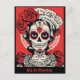 La carte postale présente un fond noir saisissant qui met en valeur l'œuvre d'art vibrante et accrocheuse en son centre. Au premier plan, une représentation pop art rouge et blanc vif de La Calavera Catrina occupe le devant de la scène. La figure de crâne iconique est ornée de détails complexes, le contraste des teintes rouges et blanches créant un impact visuel envoûtant. L'utilisation de lignes audacieuses et de traits exagérés rend hommage au style pop art, insufflant une touche contemporaine au motif traditionnel de Día de Muertos. Le visage du crâne est embelli de volutes délicates, de motifs complexes et de fioritures captivantes, reflétant l'esprit de célébration et d'art de la fête.