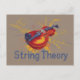 Théorie des cordes : une illustration dynamique d'un violon, avec des spirales de chambre à bulles et l'équation du mouvement de la théorie des champs à cordes fermées.