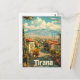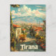 Une représentation vibrante et colorée de Tirana, la capitale de l'Albanie, qui présente son mélange d'architecture historique et moderne. Le design présente des points de repère remarquables, des rues animées et des paysages urbains animés, tous illustrés dans un style nostalgique et rétro. Cette oeuvre reflète l'esprit dynamique et le charme unique de Tirana, invitant les visiteurs à découvrir son patrimoine culturel diversifié.