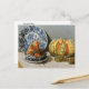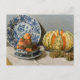 Carte postale d'art avec la peinture impressionniste, Still Life with Melon, (1872) de Claude Monet (1840-1926). Un cadre de table animé d'un melon mûr et pêche à côté d'une plaque de porcelaine bleue et blanche.