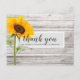 Cette carte de remerciement pour une fête d'anniversaire comporte une texture de bois avec un tournesol unique et une typographie script et moderne sont utilisées. Le verso de la carte peut être personnalisé ou le texte peut être supprimé pour un message manuscrit.