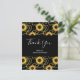 Carte postale Merci avec un motif élégant et élégant. Joli tournesol jaune et feuilles verts entourés de fines chaînes d'or. Arrière - plan noir.